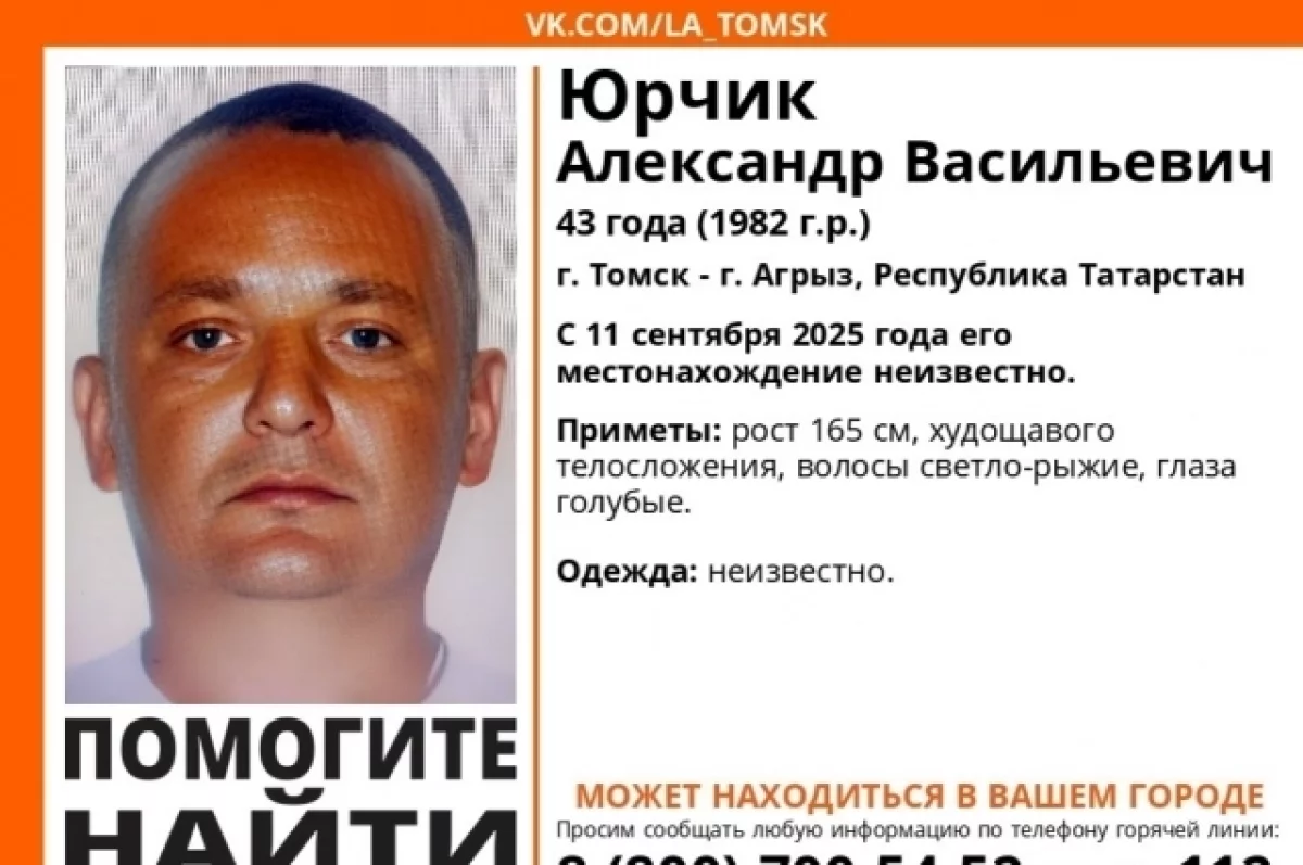 Александр Юрчик перестал выходить на связь 11 сентября 2025 года. Он следовал по маршруту из города Томска в город Агрыз (Республика Татарстан). Учитывая масштаб поиска, мужчина может находиться в любом регионе по пути следования, включая Республику Коми.